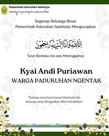 Seloharjo- Innalilahi wa innailaihi rojiun telah meninggal dunia Almarhum Kyai Andi Puriawan Padukuhan Ngentak. Pemerintah Kalurahan Seloharjo mengucapkan turut berbelasungkawa yang sedalam-dalamnya atas meninggalnya Almarhum Kyai Andi Puriawan di Padukuhan Ngentak pada hari Rabu, 01 Oktober 2025. Semoga Almarhum Husnul Khotimah, Diampuni segala khilaf dan dosanya serta di tempatkan di surga Allah SWT.