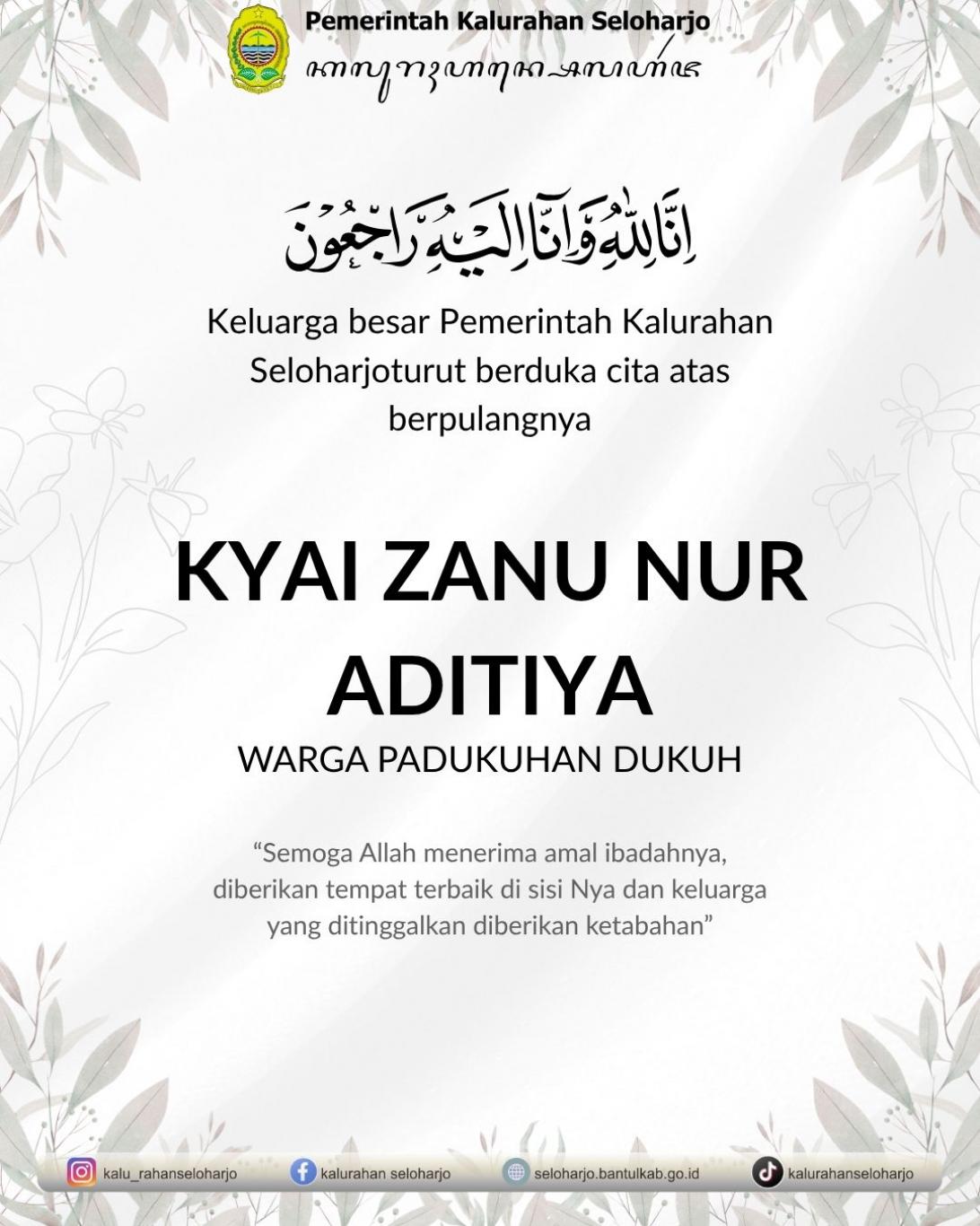 Seloharjo- Innalilahi wa innailaihi rojiun telah meninggal dunia Almarhum Kyai Zanu Nur Aditiyah di Padukuhan Dukuh. Pemerintah Kalurahan Seloharjo mengucapkan turut berbelasungkawa yang sedalam-dalamnya atas meninggalnya Almarhum Kyai Zanu Nur Aditiyah di Padukuhan Dukuh pada Jum’at, 03 Oktober 2025. Semoga Almarhum Husnul Khotimah, Diampuni segala khilaf dan dosanya serta di tempatkan di surga Allah SWT. Penyerahan Akta Kematian Almarhum Kyai Zanu Nur Aditiyah oleh Pamong Seloharjo kepada ahli waris Almarhum Kyai Zanu Nur Aditiyah warga Padukuhan Dukuh di rumah duka.
