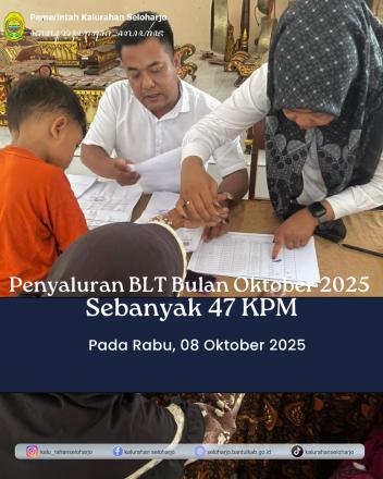 Seloharjo- Pemerintah Kalurahan Seloharjo telah menyalurkan Bantuan Langsung Tunai (BLT) Pada hari Rabu, 08 Oktober 2025 pukul 13.00 WIB di Aula Kalurahan Seloharjo Keluarga Penerima Manfaat (KPM) yang menerima bantuan berjumlah 47 KPM dan disalurkan selama 1 Bulan. Penyaluran Bantuan Langsung Tunai (BLT) Kalurahan Seloharjo berjalan dengan lancar, tertib dan kondusif.
