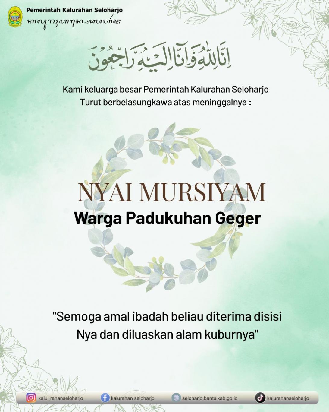 Seloharjo- Innalilahi wa innailaihi rojiun telah meninggal dunia Almarhum Nyai Mursiyam Padukuhan Geger. Pemerintah Kalurahan Seloharjo mengucapkan turut berbelasungkawa yang sedalam-dalamnya atas meninggalnya Almarhum Nyai Mursiyam di Padukuhan Geger pada hari Kamis, 09 Oktober 2025. Semoga Almarhum Husnul Khotimah, Diampuni segala khilaf dan dosanya serta di tempatkan di surga Allah SWT.