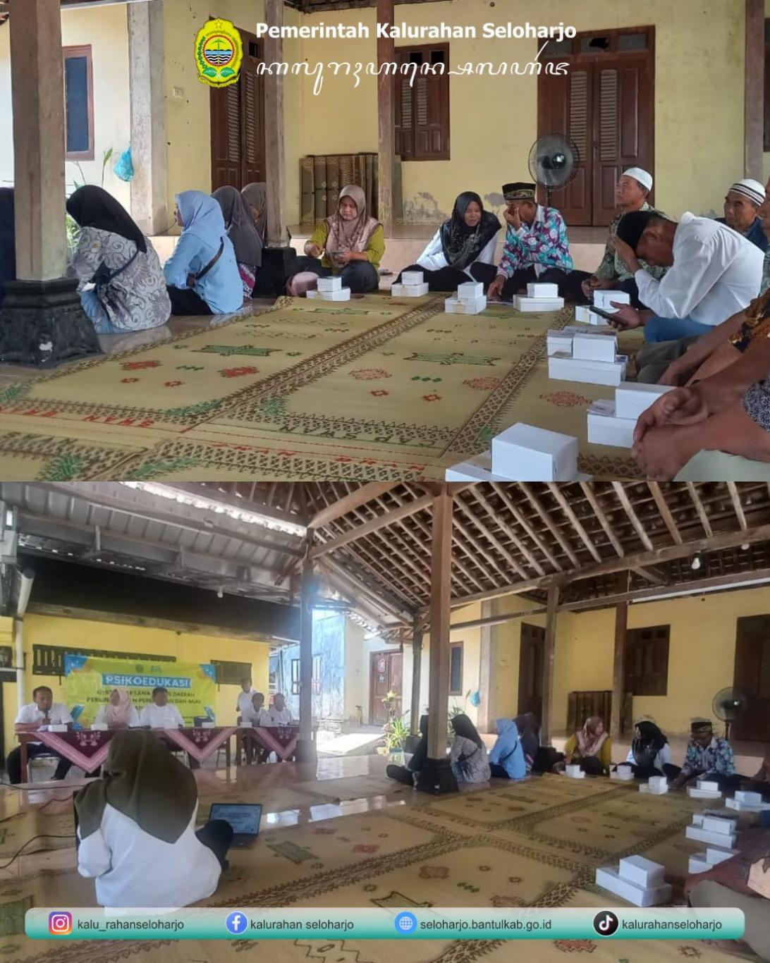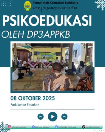 Seloharjo, 08 Oktober 2025 Kamituwa Seloharjo menghadiri Psikoedukasi di padukuhan Poyahan yang diselenggarakan oleh Dinas Pemberdayaan Perempuan dan Perlindungan Anak, Pengendalian Penduduk dan Keluarga Berencana Kabupaten Bantul. Psikoedukasi merupakan suatu tindakan meditasi yang memiliki kegunaan untuk menangani kesehatan mental seseorang. Tindakan psikoedukasi yang dilakukan pada seseorang beserta keluarganya ialah salah satu cara untuk menangani perubahan mental.