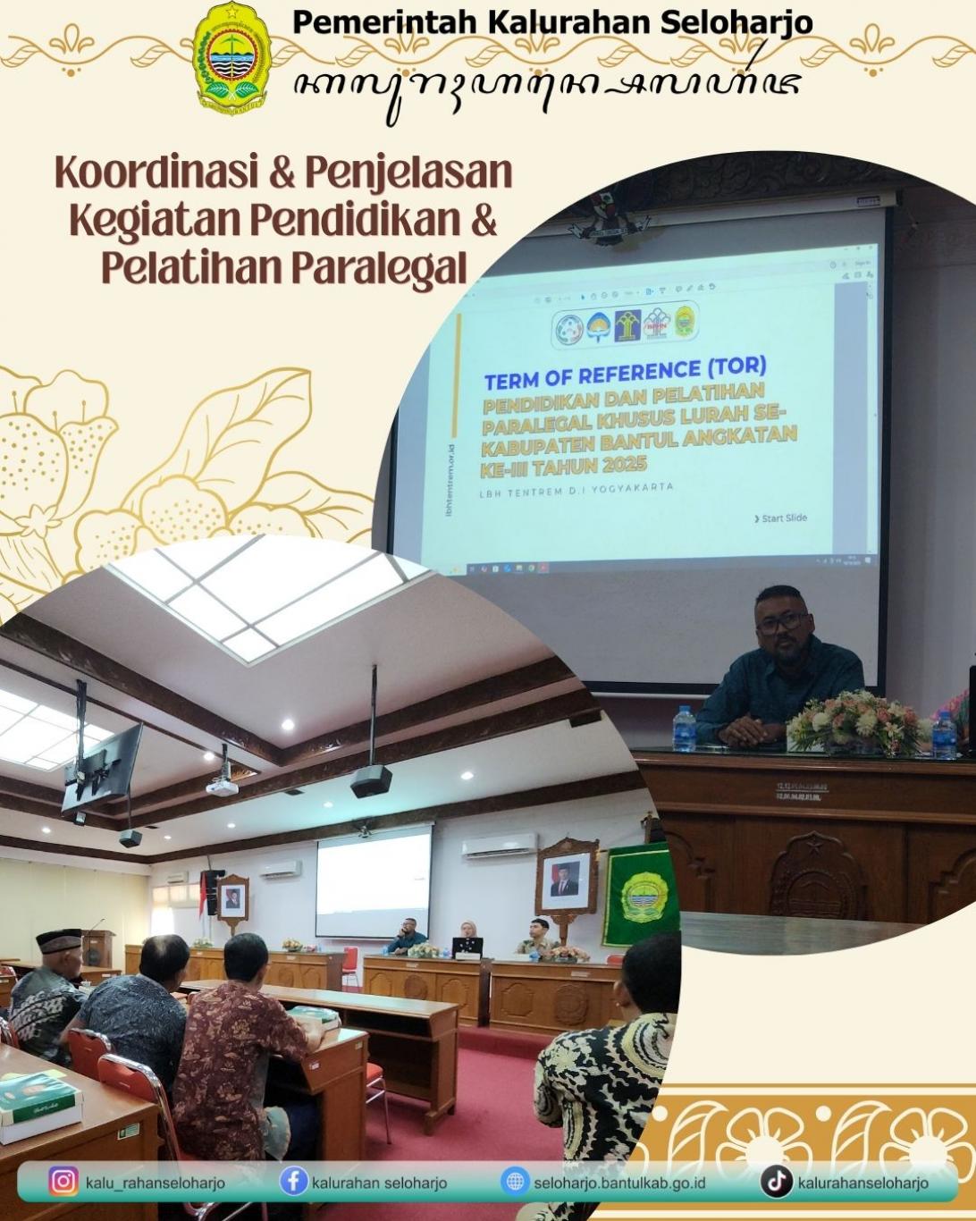 Jumat, 10 Oktober 2025 Carik Seloharjo hadir dalam acara Koordinasi dan Penjelasan Kegiatan Pendidikan dan Pelatihan Paralegal yang diadakan oleh Pemerintah Kabupaten Bantul bagian Sekertariat Daerah. Pada kegiatan tersebut, dijelaskan terkait pendidikan dan pelatihan paralegal bagi kalurahan yang ada di kabupaten Bantul.