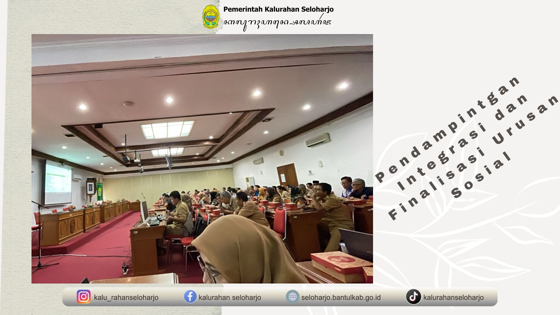 Seloharjo- Staff Kamituwa menghadiri acara Pendampingan Integrasi dan Finalisasi Urusan Sosial pada Senin, 13 Oktober 2025 di Aula L.t 3 Gedung Induk Parasamya Kabupaten Bantul. Kegiatan ini bertujuan untuk mengentaskan kemiskinan dan meningkatkan kesejahteraan masyarakat Indonesia melalui program bantuan sosial (bansos). Program integrasi ini memiliki potensi besar dalam meningkatkan efektivitas bantuan sosial dalam mempercepat keluarga Penerima Manfaat (KPM) keluar dari kemiskinan. Dalam rangka penguatan integrasi program bansos diberikan dalam tiga level yaitu :