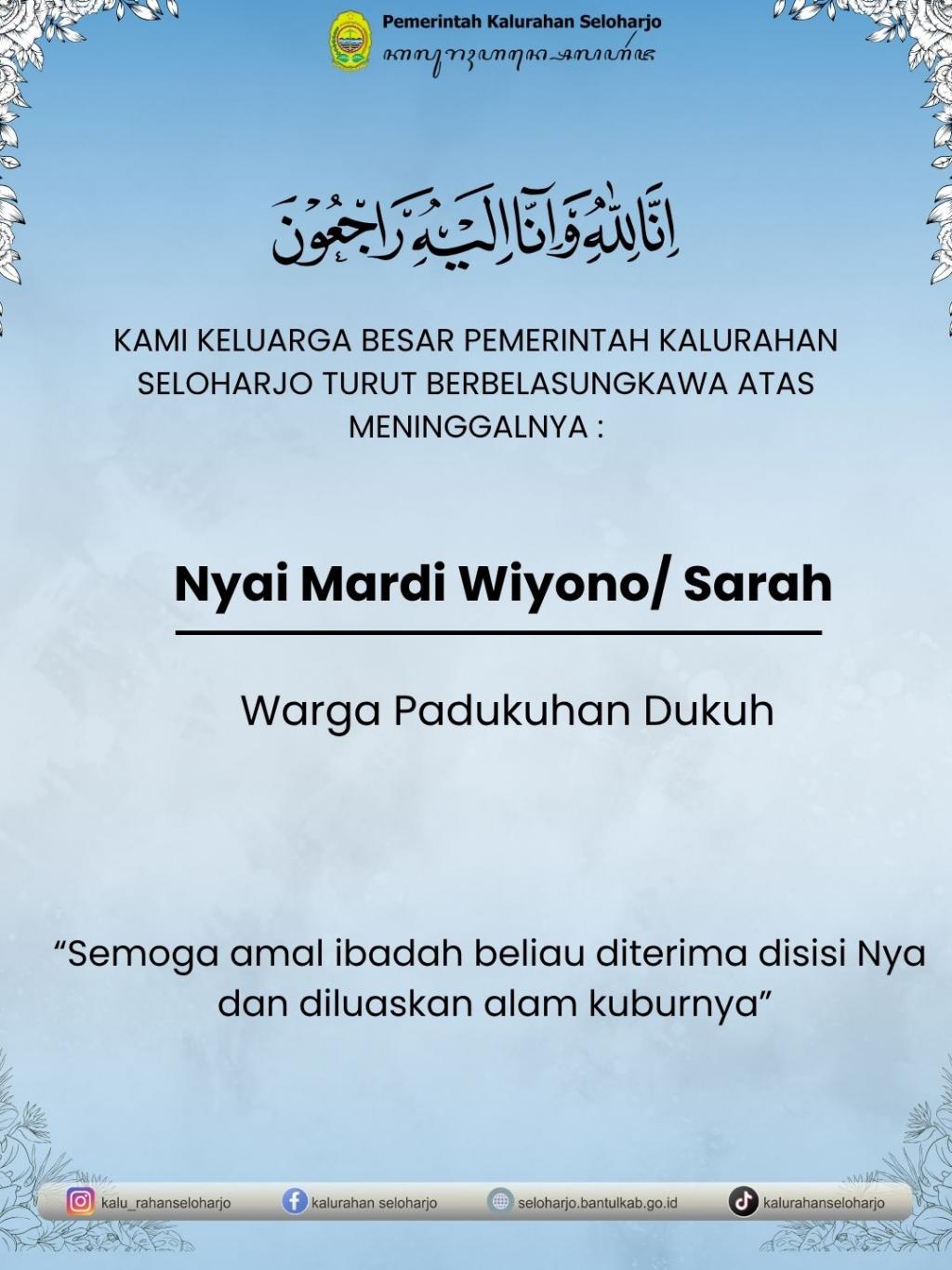 Seloharjo- Innalilahi wa innailaihi rojiun telah meninggal dunia Almarhum Nyai Mardi Wiyono/ Sarah Padukuhan Dukuh. Pemerintah Kalurahan Seloharjo mengucapkan turut berbelasungkawa yang sedalam-dalamnya atas meninggalnya Almarhum Nyai Mardi Wiyono/ Sarah di Padukuhan Dukuh pada hari Senin, 20 Oktober 2025. Semoga Almarhum Husnul Khotimah, Diampuni segala khilaf dan dosanya serta di tempatkan di surga Allah SWT.