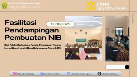 Seloharho- Dinas Penanaman Modal dan Pelayanan Terpadu Satu Pintu (DPMPTSP) Kabupaten Bantul menyelenggarakan Fasilitasi Pendampingan Pembuatan NIB Bagi Pelaku Usaha dalam Rangka Pelaksanaan Program Inovasi Gampil melalui Dana Keistimewaan Tahun 2025 pada Senin, 20 Oktober 2025 di Aula Kalurahan Seloharjo. Kegiatan ini bertujuan untuk meningkatkan kesadaran pelaku usaha terhadap pentingnya legalitas usaha, sekaligus membuka akses yang lebih luas terhadap pembinaan, pembiayaan, dan pengembangan usaha secara berkelanjutan. Melalui kegiatan ini, DPMPTSP tidak hanya memberikan layanan perizinan secara cepat dan mudah, tetapi juga sekaligus mengenalkan inovasi Gampil kepada masyarakat. Inovasi ini menjadi salah satu langkah nyata Pemerintah dalam mendorong percepatan formalitas usaha, kemudahan akses permodalan, dan pemberdayaan UMKM secara menyeluruh.