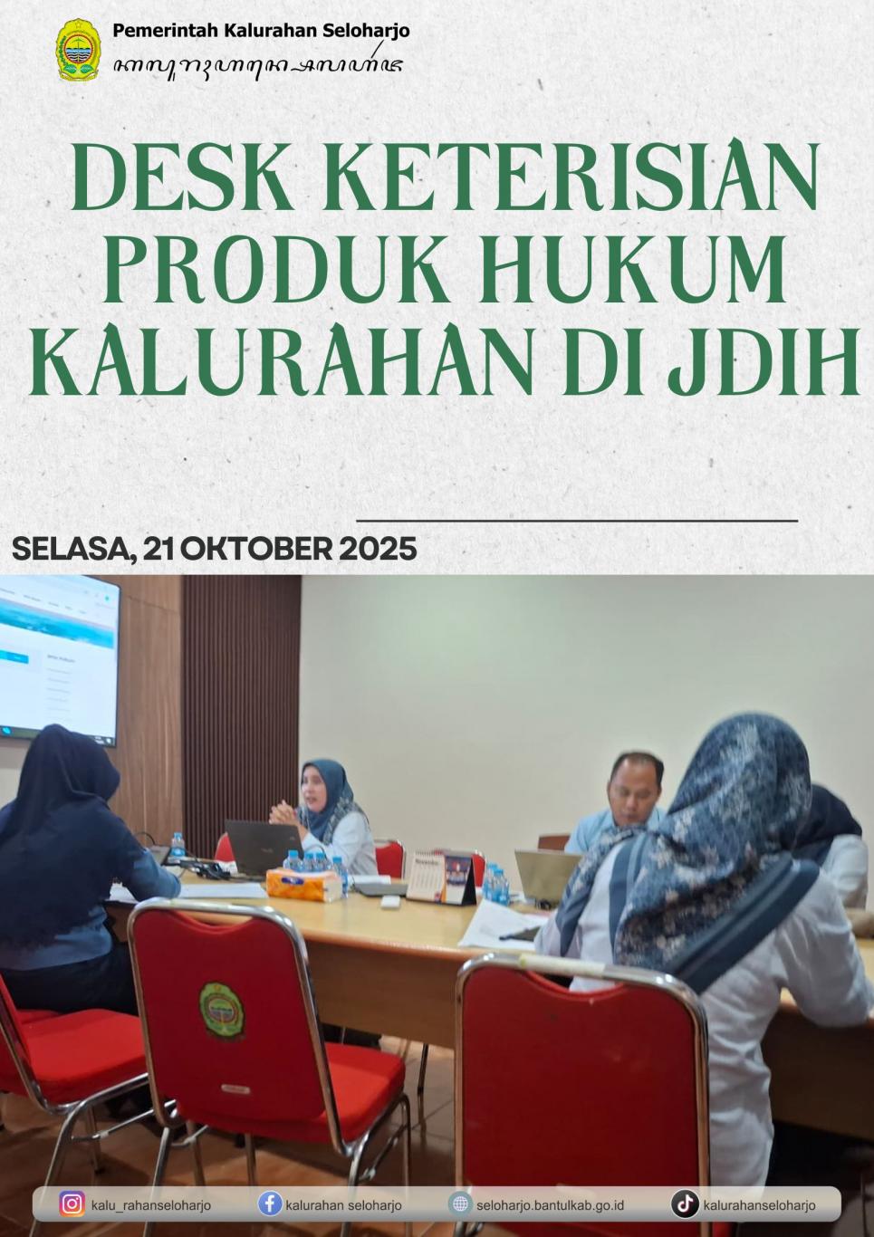 Seloharjo- Pangripta Seloharjo menghadiri Desk Keterisian Produk Hukum Kalurahan di JDIH pada Selasa, 21 Oktober 2025 di RR Bagian Hukum Setda Kabupaten Bantul. Kegiatan ini bertujuan untuk Pengelolaan Jaringan Dokumentasi dan Informasi Hukum (JDIH) di lingkungan Pemerintah Daerah sebagai upaya penting dalam menjaga transparansi, akuntabilitas, dan kepastian hukum. Dengan pengelolaan yang baik, JDIH dapat menjadi sumber informasi yang bermanfaat bagi semua pihak yang membutuhkan informasi hukum di Daerah.