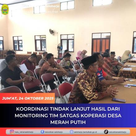 Seloharjo- Pemerintah Kalurahan Seloharjo kembali menyelenggarakan Koordinasi Tindak Lanjut Hasil dari Monitoring Tim Satgas Koperasi Desa Merah Putih pada Jum’at, 24 Oktober 2025 di Aula Kalurahan Seloharjo yang turut dihadiri oleh Plt Panewu Anom Kapanewon Pundong, Carik Seloharjo beserta Pamong Kalurahan Seloharjo. Kegiatan ini bertujuan untuk mengetahui sejauh mana KDMP Kalurahan Seloharjo berjalan. Pada kesempatan tersebut, Lurah Seloharjo menginstruksikan seluruh Pamong dan Staf serta Badan Musyawarah Kalurahan (Bamuskal) menjadi anggota KDMP. Sejalan dengan adanya hal tersebut, Koperasi Desa Merah Putih (KDMP) Kalurahan Seloharjo akan menjalankan usaha dengan menjadi reseller air kemasan Banew dan Pospay.