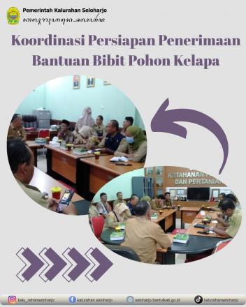 Seloharjo- Lurah Kalurahan Seloharjo menghadiri Koordinasi Persiapan Penerimaan Bantuan Bibit Pohon Kelapa pada Senin, 27 Oktober 2025 di ruang rapat Dinas Pertanian Kabupaten Bantul. Kegiatan ini bertujuan untuk meningkatkan produksi panen kelapa dalam milik petani atau kelompok tani, memupuk dan meningkatan rasa kebersamaan kelompok dengan semangat gotong royong dan membantu Pemerintah dalam mensukseskan program pengentasan kemiskinan.