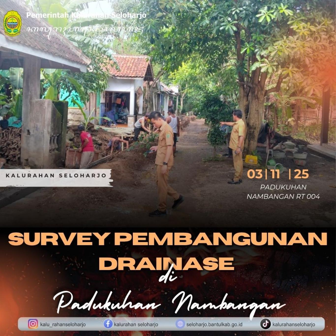 Seloharjo- Lurah Seloharjo, Ulu-ulu Seloharjo, Tim Pelaksana Kegiatan Seloharjo dan Bhabinkamtibmas Seloharjo pada Senin, 03 November 2025 melaksanakan Survey Pembangunan Drainase di Padukuhan Nambangan RT 004 Seloharjo. Pembangunan drainase ini didanai oleh Pemerintah Kalurahan melalui Dana Desa, warga masyarakat Padukuhan Nambangan RT 004 begitu antusias ikut gotong royong, mulai dari Bapak-bapak. Masyarakat berharap semoga Pemerintah selalu memperhatikan pembangunan fasilitas umum terutama drainase yang sudah rusak, untuk memastikan bahwa pembangunan drainase berjalan sesuai dengan perencanaan yang matang dan memenuhi kebutuhan masyarakat setempat.