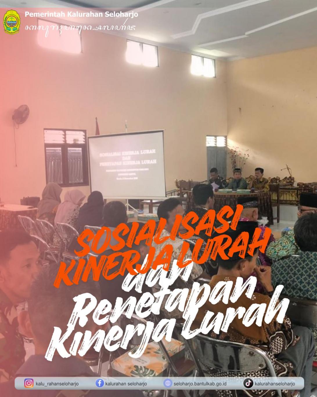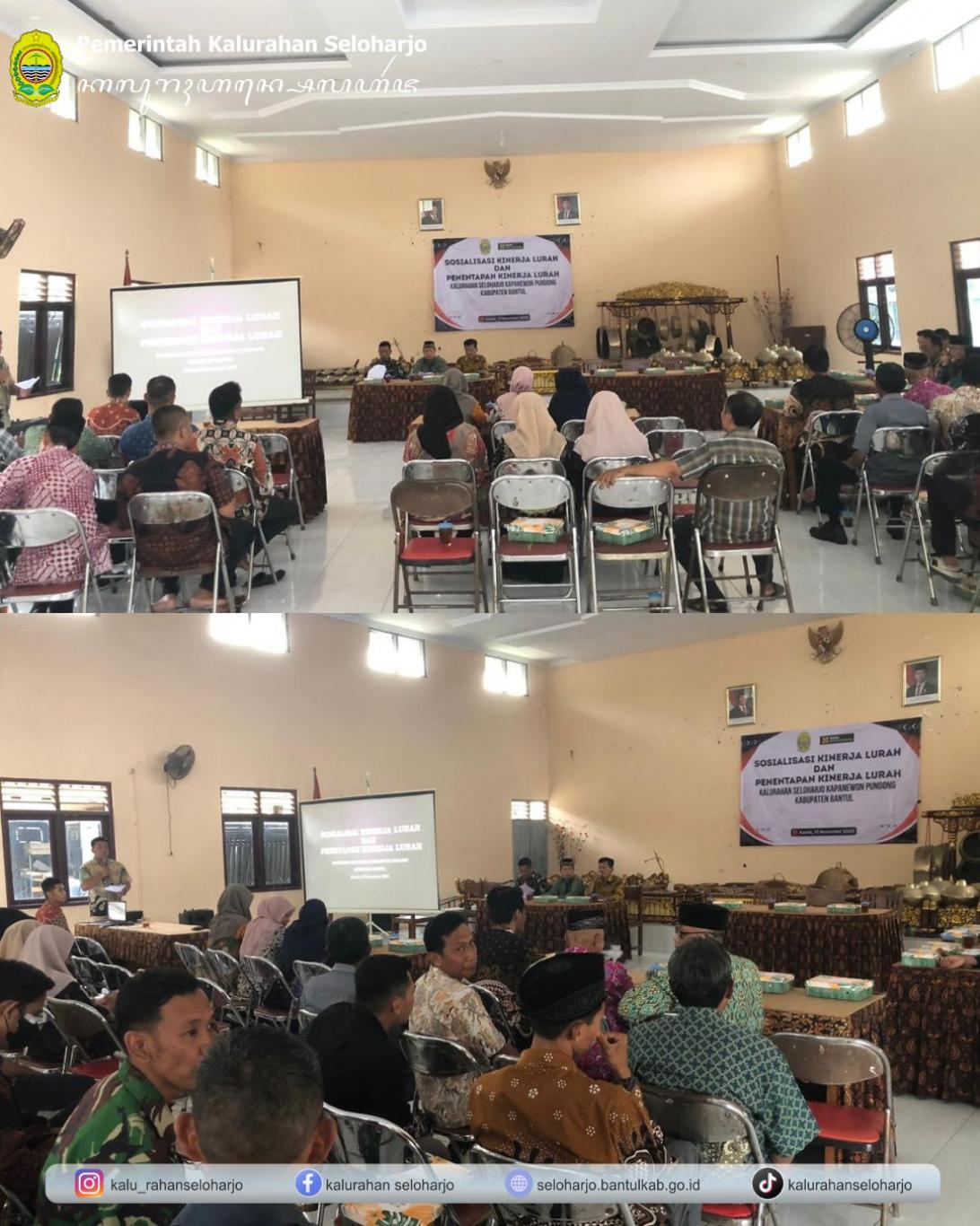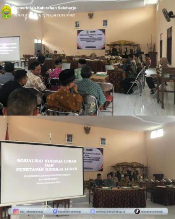 Seloharjo- Pemerintah Kalurahan Seloharjo melaksanakan Sosialisasi Kinerja Lurah dan Penetapan Kinerja Lurah pada Kamis, 13 November 2025 di Aula Kalurahan Seloharjo turut dihadiri oleh Lurah Seloharjo, Carik Seloharjo, Badan Musyawarah Kalurahan, Pendamping Kalurahan, Bhabinsa Seloharjo beserta Pamong Kalurahan Seloharjo. Kegiatan ini bertujuan untuk menyusun dan menetapkan target kinerja Lurah yang akan diukur. Proses ini meliputi sosialisasi mengenai indikator-indikator yang harus dicapai seperti penurunan Kartu Keluarga miskin, penurunan angka stunting, peningkatan Pendapatan Asli Kalurahan, serta peningkatan pelayanan kepada masyarakat harus ditingkatkan seiring dengan perkembangan. Sudah menjadi kewajiban sebagai pamong untuk senantiasa meningkatkan kapasitas dalam melayani masyarakat dengan baik.