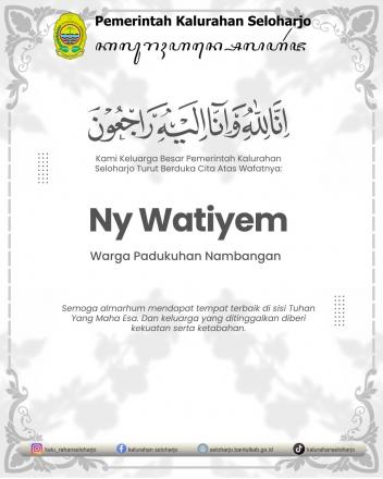 Innalilahi wa innailaihi rojiun telah meninggal dunia Almarhumah Nyai Watiyem Padukuhan Nambangan. Pemerintah Kalurahan Seloharjo mengucapkan turut berbelasungkawa yang sedalam-dalamnya atas meninggalnya Almarhumah Nyai Watiyem di Padukuhan Nambangwn pada hari Sabtu, 15 November 2025. Semoga Almarhumah Husnul Khotimah, Diampuni segala khilaf dan dosanya serta di tempatkan di surga Allah SWT.