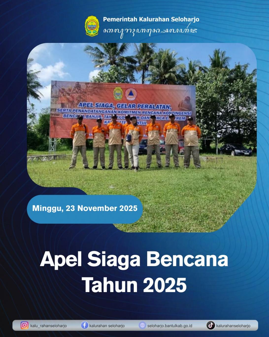 Seloharjo- Jagabaya Seloharjo dan FPRB Seloharjo menghadiri Apel Siaga Bencana Tahun 2025 pada Minggu, 23 November 2025 di Lapangan Trirenggo Kabupaten Bantul turut dihadir Bupati Bantul Abdul Halim Muslih. Apel siaga bencana tahun 2025 sebagai upaya memperkuat koordinasi dan kesiapsiagaan seluruh unsur dalam menghadapi potensi bencana. Kegiatan ini bertujuan untuk meningkatkan pengetahuan masyarakat Kabupaten Bantul tentang kebencanaan dan bagaimana langkah - langkah untuk melakukan mitigasi bencana.