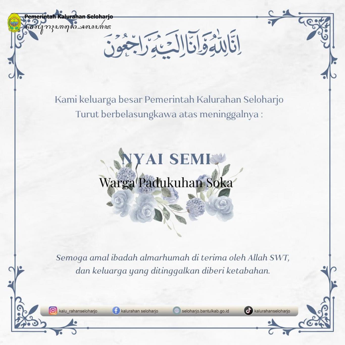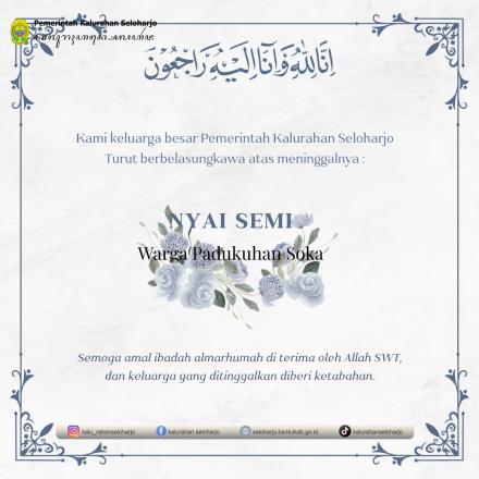 Seloharjo- Innalilahi wa innailaihi rojiun telah meninggal dunia Almarhum Nyai Semi di Padukuhan Soka. Pemerintah Kalurahan Seloharjo mengucapkan turut berbelasungkawa yang sedalam-dalamnya atas meninggalnya Almarhum Nyai Semi di Padukuhan Soka pada Selasa, 25 November 2025. Semoga Almarhum Husnul Khotimah, Diampuni segala khilaf dan dosanya serta di tempatkan di surga Allah SWT. Penyerahan Akta Kematian Almarhum Nyai Semi oleh Pamong Seloharjo kepada ahli waris Almarhum Nyai Semi warga Padukuhan Soka di rumah duka.