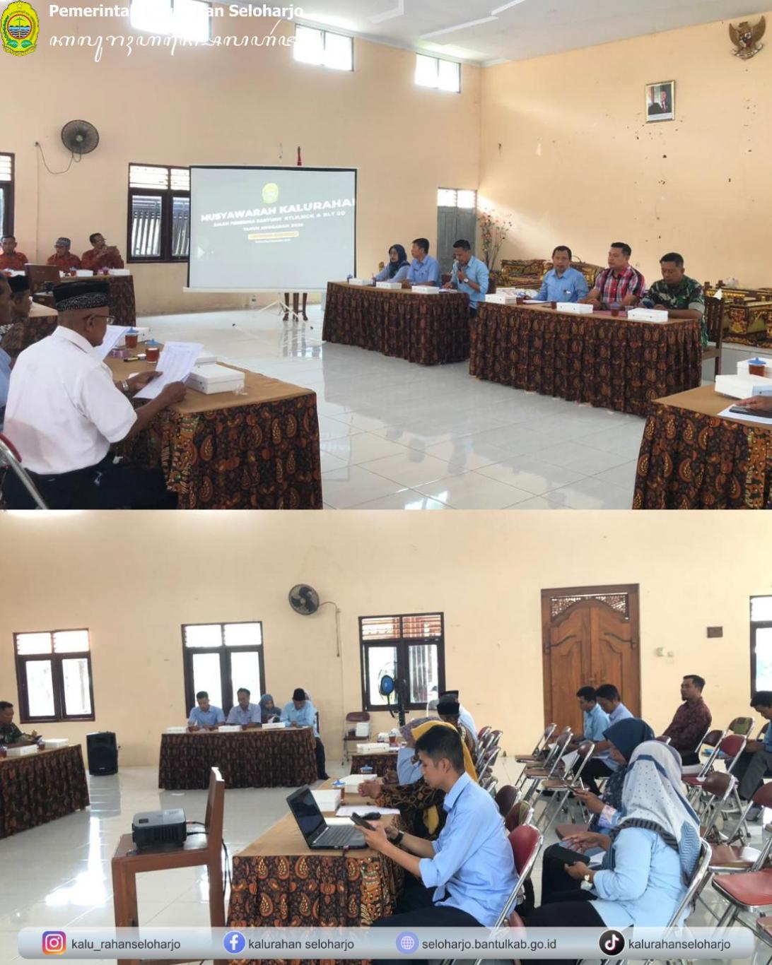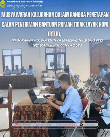 Seloharjo- Pemerintah Kalurahan Seloharjo menyelenggarakan Musyawarah Kalurahan dalam Rangka Penetapan Calon Peneriman Bantuan Rumah Tidak Layak Huni (RTLH), Pembangunan MCK dan Bantuan Langsung Tunai Dana Desa (BLT DD) Tahun Anggaran 2026 pada Selasa, 02 Desember 2025 di Aula Kalurahan Seloharjo yang turut dihadiri oleh Plt Panewu Anom Kapanewon Pundong, Kepala Jawatan Praja Kapanewon Pundong, Badan Musyawarah Kalurahan Seloharjo, Carik Seloharjo, beserta Jajaran Pamong Kalurahan Seloharjo, Bhabinkamtibmas Seloharjo, Babinsa Seloharjo dan unsur Lembaga Kalurahan Seloharjo . Kegiatan ini menetapkan bahwa data hasil pendataan lapangan yang telah dilakukan sudah mencakup calon penerima RTLH dan MCK, serta BLT Dana Desa bagi warga yang tergolong miskin, rentan, dan terdampak kondisi sosial ekonomi. Setelah dilakukan pembahasan secara terbuka, para peserta musyawarah memberikan masukan dan klarifikasi terhadap data calon penerima. Beberapa usulan perbaikan dan penyesuaian diterima, dengan tujuan agar bantuan benar-benar diberikan kepada warga yang paling membutuhkan.
