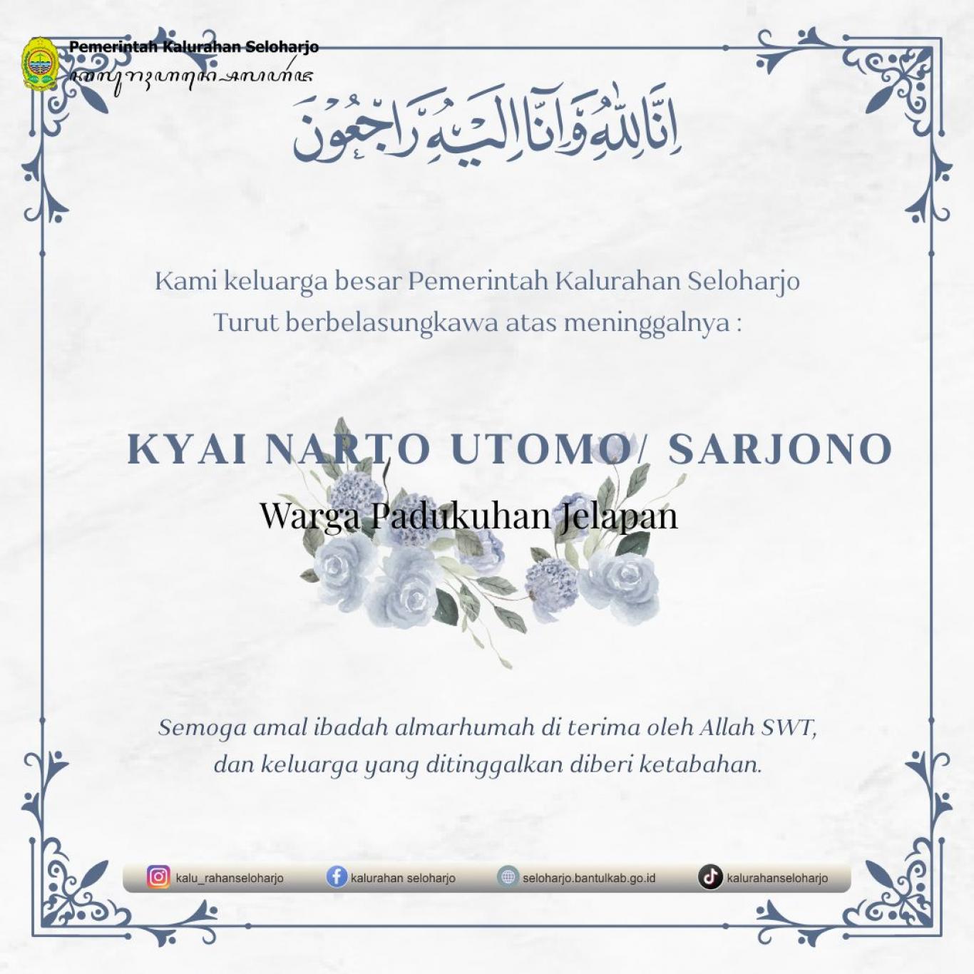 Seloharjo- Innalilahi wa innailaihi rojiun telah meninggal dunia Almarhum Kyai Narto Utomo/ Sarjono di Padukuhan Jelapan. Pemerintah Kalurahan Seloharjo mengucapkan turut berbelasungkawa yang sedalam-dalamnya atas meninggalnya Almarhum Kyai Narto Utomo/ Sarjono di Padukuhan Jelapan pada Kamis, 04 Desember 2025. Semoga Almarhum Husnul Khotimah, Diampuni segala khilaf dan dosanya serta di tempatkan di surga Allah SWT.