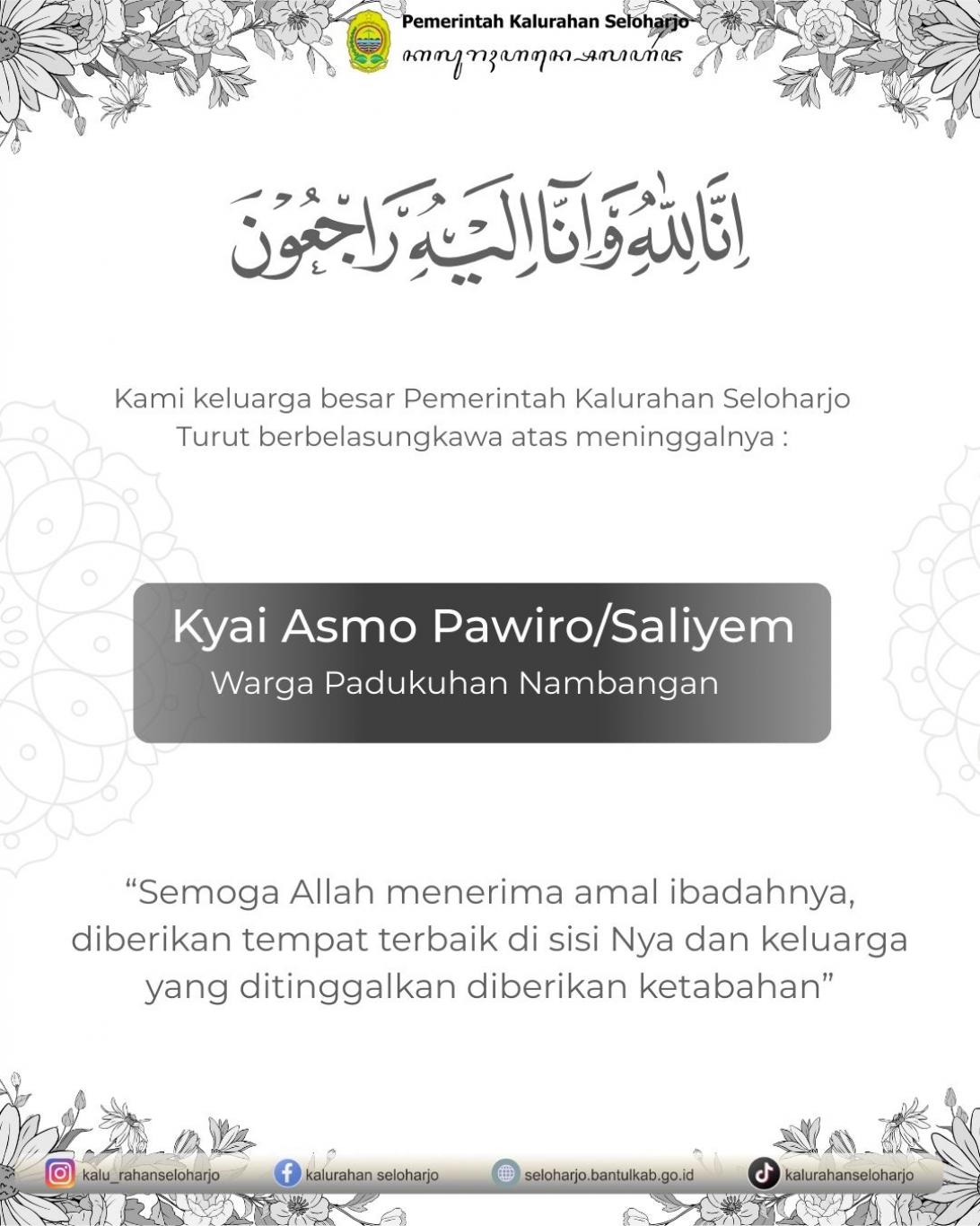 Innalilahi wa innailaihi rojiun telah meninggal dunia Almarhum Kyai Asmo Pawiro/Saliyem Padukuhan Nambangan. Pemerintah Kalurahan Seloharjo mengucapkan turut berbelasungkawa yang sedalam-dalamnya atas meninggalnya Almarhum Kyai Asmo Pawiro/Saliyem di Padukuhan Nambangan pada hari Sabtu, 13 Desember 2025. Semoga Almarhum Husnul Khotimah, Diampuni segala khilaf dan dosanya serta di tempatkan di surga Allah SWT.
