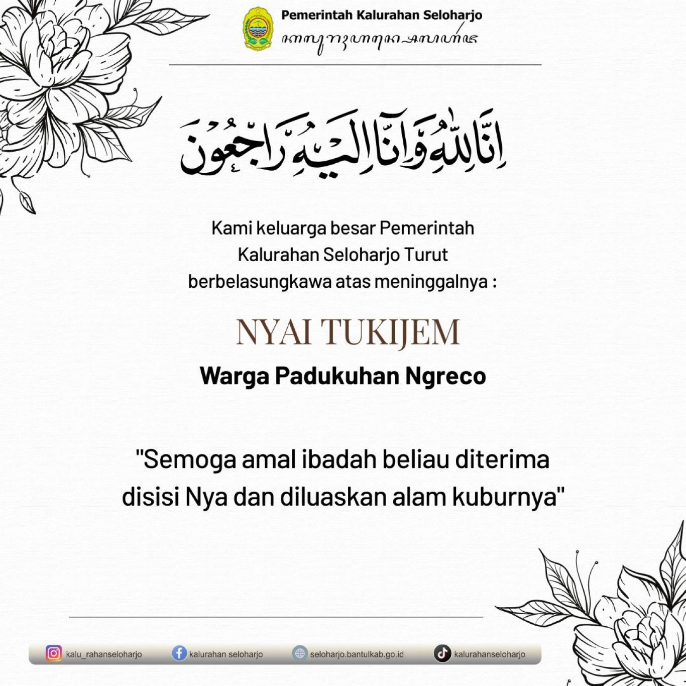 Innalilahi wa innailaihi rojiun telah meninggal dunia Almarhum Nyai Tukijem Padukuhan Ngreco. Pemerintah Kalurahan Seloharjo mengucapkan turut berbelasungkawa yang sedalam-dalamnya atas meninggalnya Almarhum Nyai Tukijem di Padukuhan Ngreco pada hari Kamis, 18 Desember 2025. Semoga Almarhum Husnul Khotimah, Diampuni segala khilaf dan dosanya serta di tempatkan di surga Allah SWT.