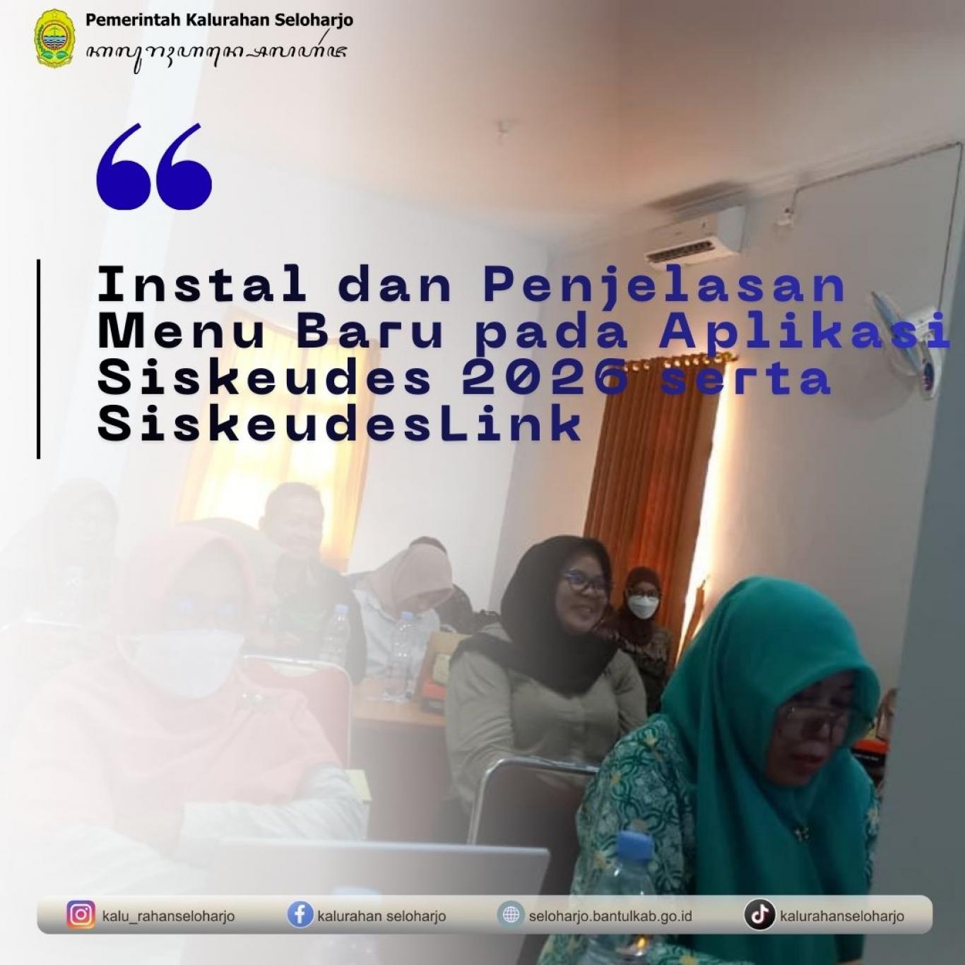 Seloharjo- Danarta Seloharjo menghadiri Instal dan Penjelasan Menu pada Aplikasi Siskeudes 2026 serta SiskeudesLink pada Sabtu, 19 Desember 2025 di Ruang rapat Dinas PMK Kabupaten bantul. Kegiatan ini bertujuan untuk memberikan kemudahan dalam pengelolaan keuangan Desa dalam melakukan siklus pengelolaan keuangan perencanaan, penatausahaan (pencatatan), pelaporan, dan pengarsipan.