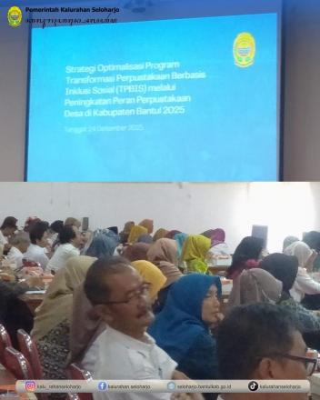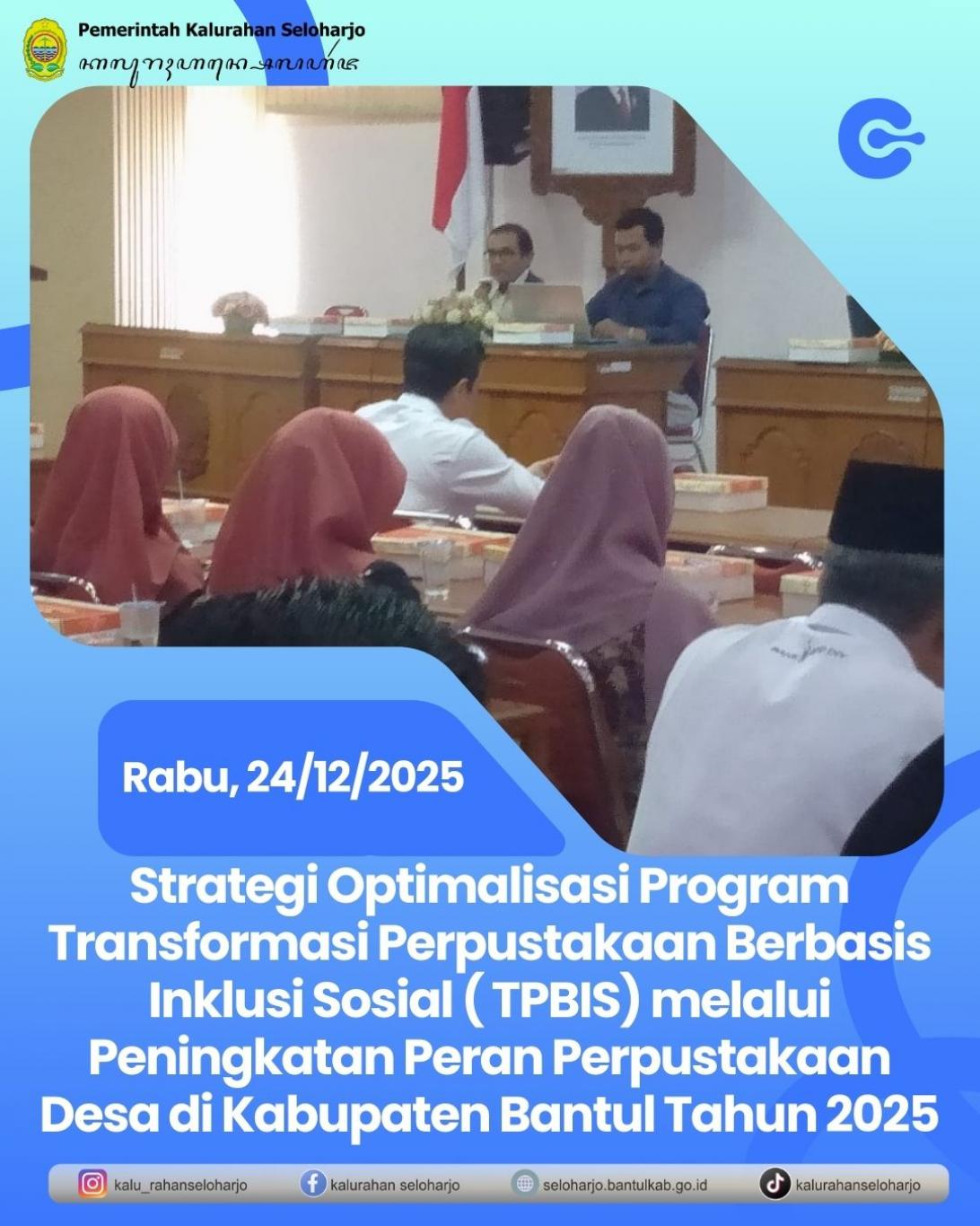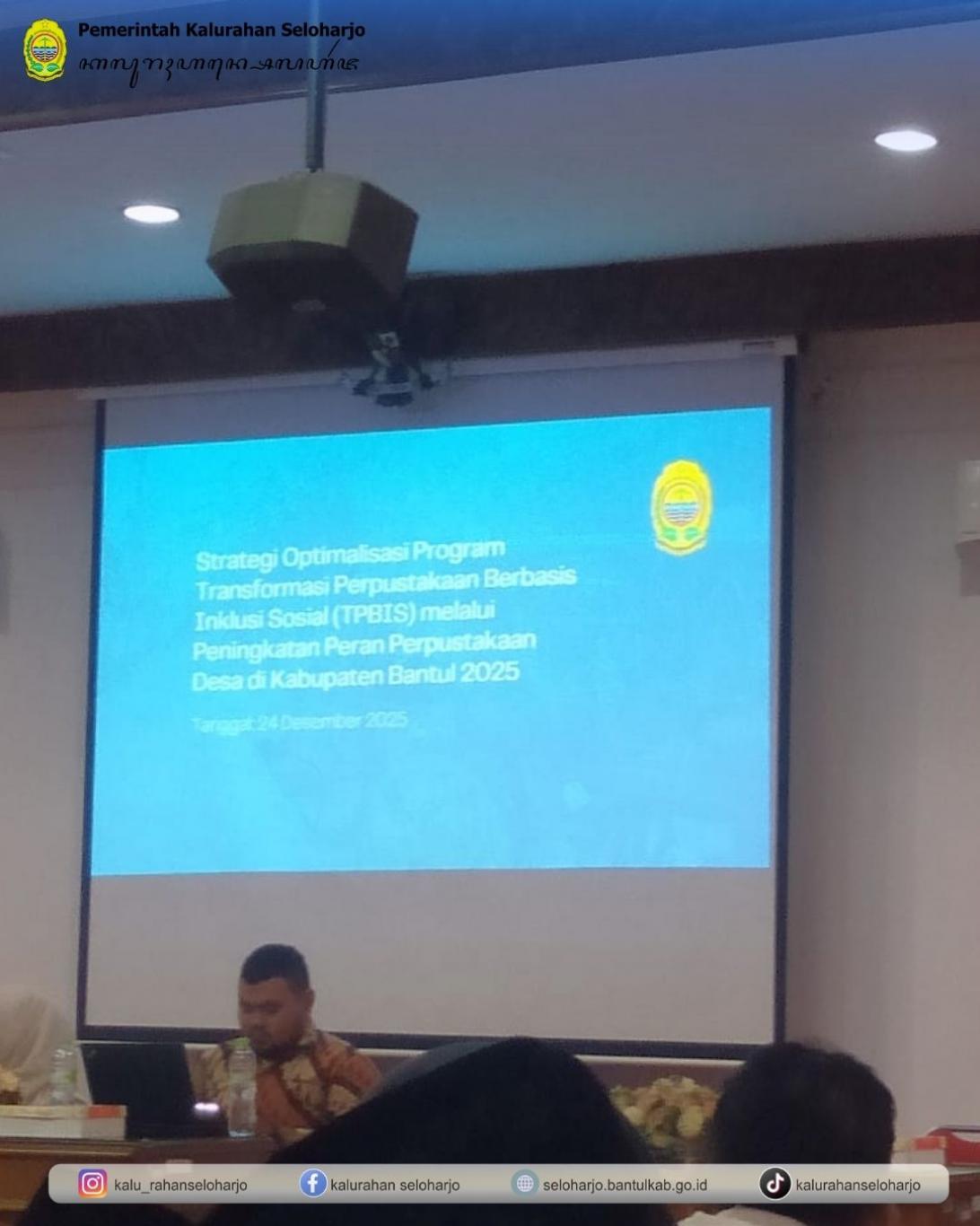 Seloharjo- Tata Laksana Seloharjo menghadiri Strategi Optimalisasi Program Transformasi Perpustakaan Berbasis Inklusi Sosial ( TPBIS ) melalui Peningkatan Peran Perpustakaan Desa di Kabupaten Bantul Tahun 2025 pada Rabu, 24 Desember 2025 di Ruang Mandala Saba Madya, Gedung Induk Lantai 3 Parasamya. Sesuai dengan Peraturan Daerah Kabupaten Bantul Nomor 3 Tahun 2023 tentang penyelenggaraan dan pengelolaan perpustakaan oleh Kepala Dinas Perpustaan dan Kearsiapan Kabupaten Bantul, optimalisasi terhadap pemberdayaan perpustakaan Kalurahan tetap harus ditingkatkan.