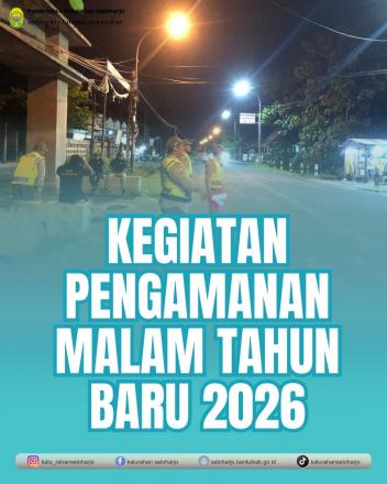 Seloharjo- Pemerintah Kalurahan Seloharjo pada Kamis, 01 Januari 2026 melaksanakan Kegiatan Pengamanan Malam Tahun Baru 2026 dilaksanakan di Kalurahan Seloharjo. Pemantauan Keamanan pada malam tahun baru 2026 ini bersama dengan Forkompimkap Kapanewon Pundong, Lurah Seloharjo, Jagabaya Seloharjo, Bhabinkamtibmas, Bhabinsa, Limnas Seloharjo beserta FPRB Seloharjo. Kegiatan ini diawali dengan koordinasi terlebih dahulu untuk memastikan aman dalam menyambut pergantian tahun, secara keseluruhan hasil pengamanan malam tahun baru 2026 Kalurahan Seloharjo aman.