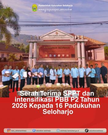 Seloharjo-Pemerintah Kalurahan Seloharjo menyelenggarakan Serah Terima SPPT dan Intensifikasi PBB P2 Tahun 2026 Kepada 16 Padukuhan Seloharjo pada Selasa, 13 Januari 2026 di Aula Kalurahan Seloharjo yang turut dihadiri oleh Ibu Vita Yuliatun, SSTP, M, Eng selaku Panewu Kapanewon Pundong, Ibu Haryani S.IP selaku Kepala Jawatan Praja Kapanewon Pundong, KPK Kapanewon Pundong, Lurah Seloharjo beserta Dukuh se Seloharjo. Kegiatan ini merupakan bagian dari koordinasi rutin awal untuk memastikan target pendapatan pajak Daerah dapat tercapai tepat waktu. Dukuh selaku kepala kewilayahan dihimbau untuk segera mendistribusikan lembar SPPT kepada warga agar pembayaran dapat dilakukan sebelum jatuh tempo pada bulan Agustus.