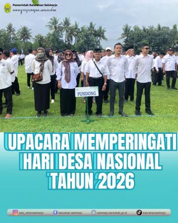 Seloharjo- Lurah beserta Pamong dan Staff Kalurahan Seloharjo menghadiri Upacara memperingati Hari Desa Nasional pada Rabu, 14 Januari 2026 di Lapangan Trirenggo Kabupaten Bantul. Kegiatan ini bertujuan untuk mengenang kontribusi besar Desa terhadap kemajuan Negara, tetapi juga sebagai peringatan akan tantangan yang dihadapi Desa dalam memperjuangkan kesejahteraan masyarakat.
