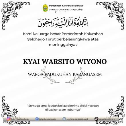 Seloharjo- Innalilahi wa innailaihi rojiun telah meninggal dunia Almarhum Kyai Warsito Wiyono di Padukuhan Karangasem . Pemerintah Kalurahan Seloharjo mengucapkan turut berbelasungkawa yang sedalam-dalamnya atas meninggalnya Almarhum Kyai Warsito Wiyono di Padukuhan Karangasem pada Jum’at, 16 Januari 2026. Semoga Almarhum Husnul Khotimah, Diampuni segala khilaf dan dosanya serta di tempatkan di surga Allah SWT.