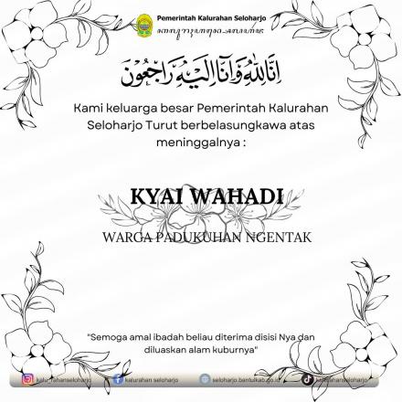 Seloharjo- Innalilahi wa innailaihi rojiun telah meninggal dunia Almarhum Kyai Wahadi di Padukuhan Ngentak. Pemerintah Kalurahan Seloharjo mengucapkan turut berbelasungkawa yang sedalam-dalamnya atas meninggalnya Almarhum Kyai Wahadi di Padukuhan Ngentak pada Sabtu, 17 Januari 2026. Semoga Almarhum Husnul Khotimah, Diampuni segala khilaf dan dosanya serta di tempatkan di surga Allah SWT.