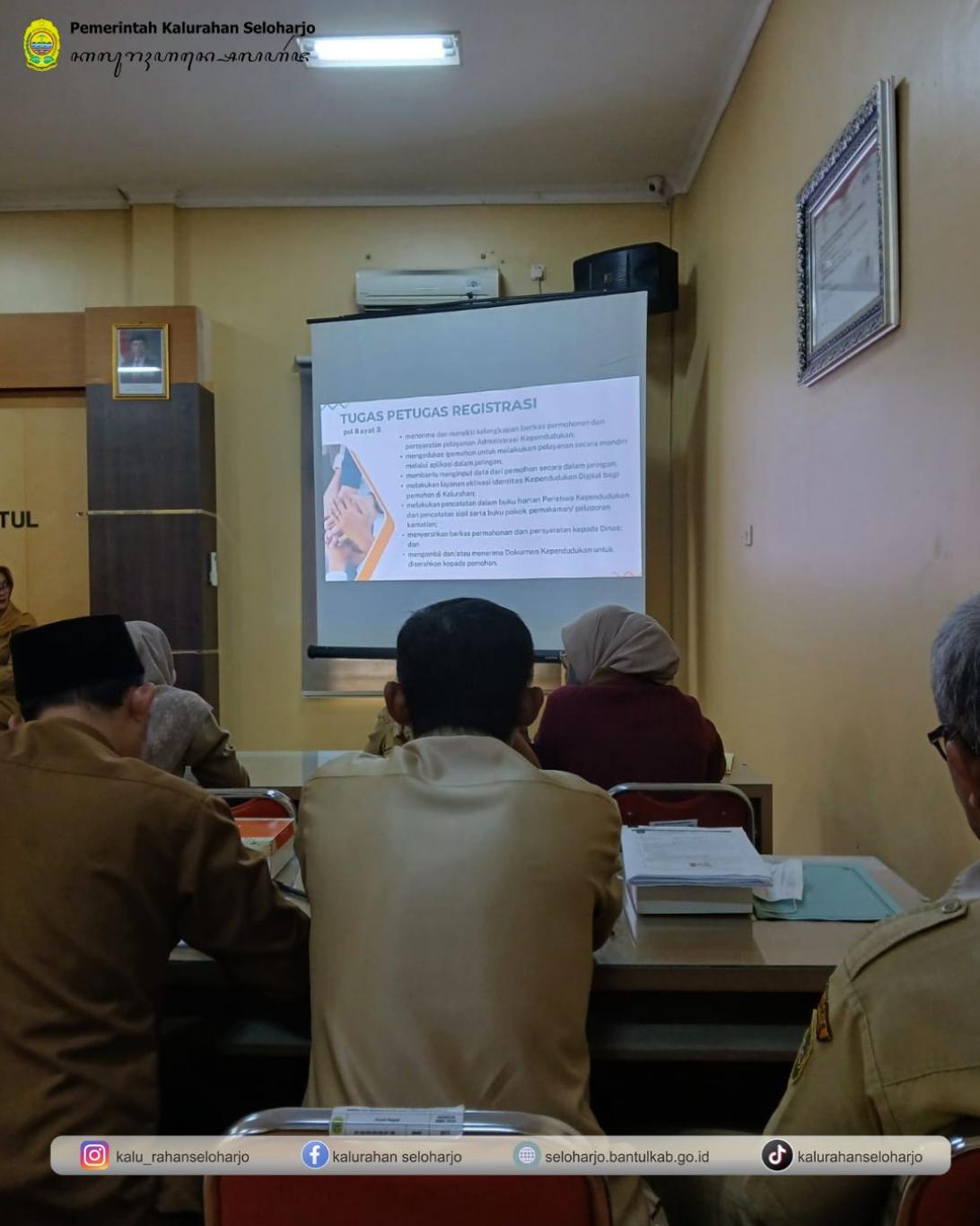 Seloharjo- Staff Danarta Seloharjo menghadiri Sosialisasi Perbub Nomor 56 Tahun 2025 Tentang Pedoman Pelayanan Administrasi Kependudukan dan Evaluasi Layanan Adminduk pada Senin, 26 Januari 2026 di Ruang Rapat Disdukcapil Kabupaten Bantul. Kegiatan ini bertujuan untuk meningkatkan kualitas pelayanan publik yang berbasis data yang valid dan akurat. Dalam program Adminduk ini, masyarakat diharapkan dapat lebih memahami tata cara pengurusan dokumen kependudukan dengan benar dan tepat waktu, seperti KTP, KK, Akta Kelahiran, dan dokumen penting lainnya.