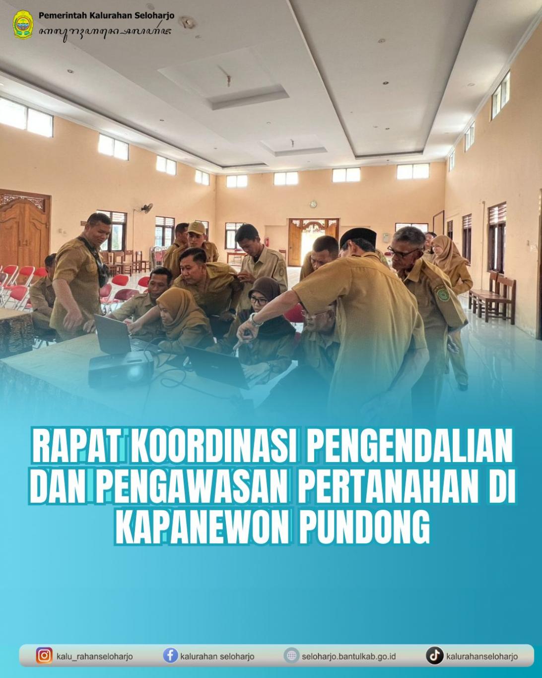 Seloharjo- Dinas Pertanahan dan Tata Ruang Kabupaten Bantul menyelenggarakan Rapat Koordinasi Pengendalian dan Pengawasan Pertanahan di Kapanewon Pundong pada Senin, 09 Februari 2026 di Aula Kalurahan Seloharjo yang dihadiri oleh Kepala Dinas Pertanahan dan Tata Ruang Kabupaten Bantul, Sekretaris Dinas Pertanahan dan Tata Ruang Kabupaten Bantul, Kepala Bidang Pengendalian, Pengawasan dan Pembinaan DPTR Kabupaten Bantul, Kepala Seksi Pengendalian dan Pengawasan Pertanahan DPTR Kabupaten Bantul, Jagabaya Seloharjo beserta Dukuh se Seloharjo. Kegiatan ini bertujuan untuk memastikan pemanfaatan tanah sesuai peruntukan, mencegah konflik dan menjaga tertib administrasi pertanahan.
