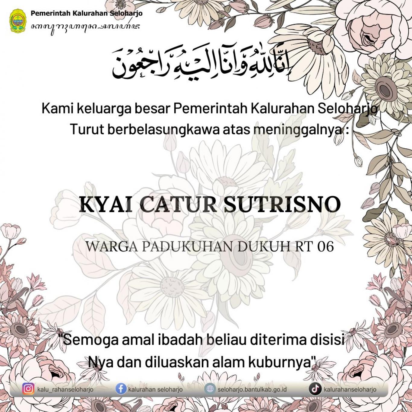 Seloharjo- Innalilahi wa innailaihi rojiun telah meninggal dunia Almarhum Kyai Catur Sutrisno di Padukuhan Dukuh RT 06. Pemerintah Kalurahan Seloharjo mengucapkan turut berbelasungkawa yang sedalam-dalamnya atas meninggalnya Almarhum Kyai Catur Sutrisno di Padukuhan Dukuh RT 06 pada Minggu, 22 Februari 2026. Semoga Almarhum Husnul Khotimah, Diampuni segala khilaf dan dosanya serta di tempatkan di surga Allah SWT.