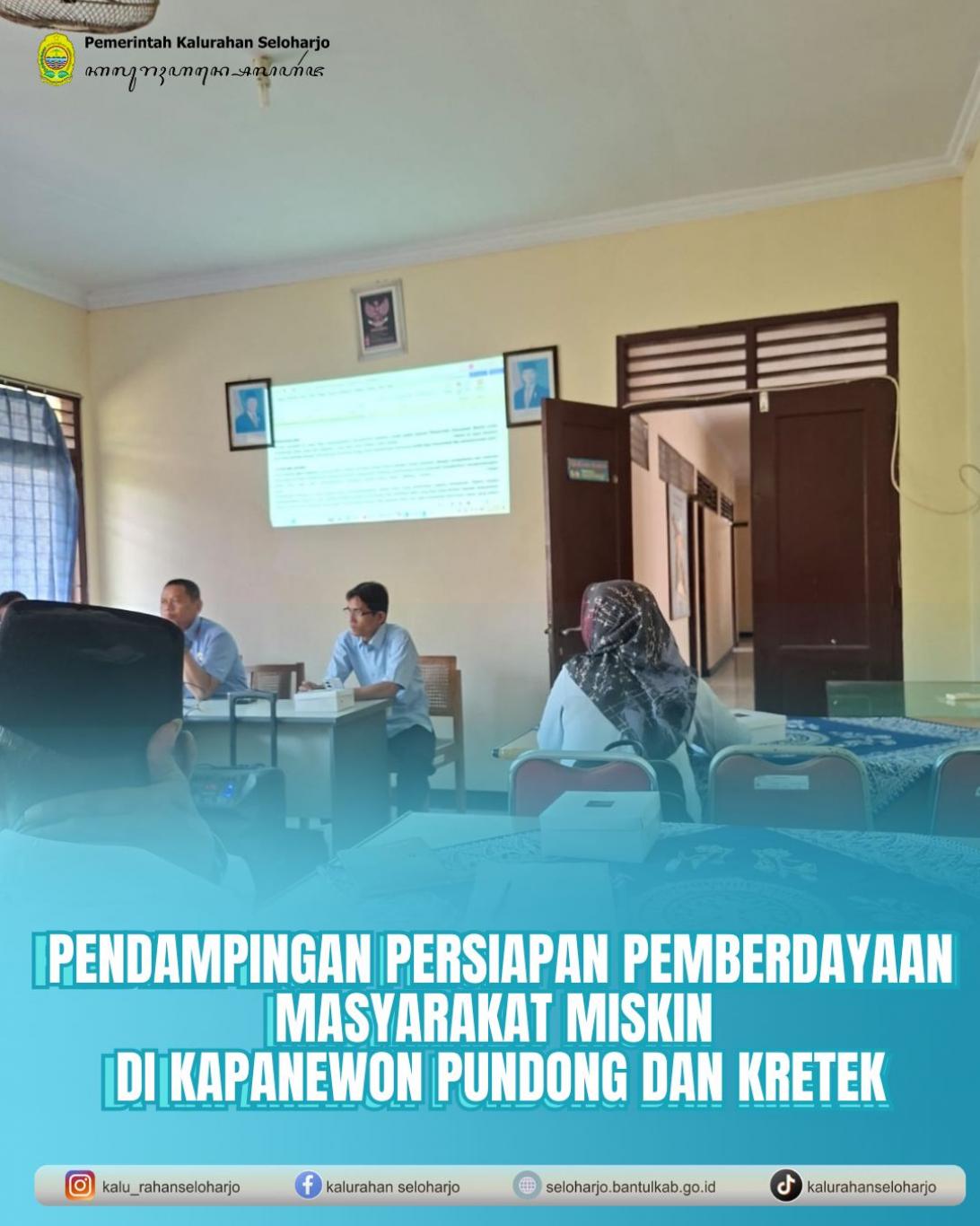 Seloharjo- Ulu-ulu Seloharjo menghadiri Pendampingan Persiapan Pemberdayaan Masyarakat Miskin di Kapanewon Pundong dan Kretek pada Selasa, 24 Februari 2026 di Pendopo Kapanewon Kretek Jalan Parangtritis Km 12, Donotirto, Kretek, Bantul. Kegiatan ini bertujuan untuk meningkatkan kemampuan dan kemandirian masyarakat miskin dalam memenuhi kebutuhan dasar dan meningkatkan taraf hidup.