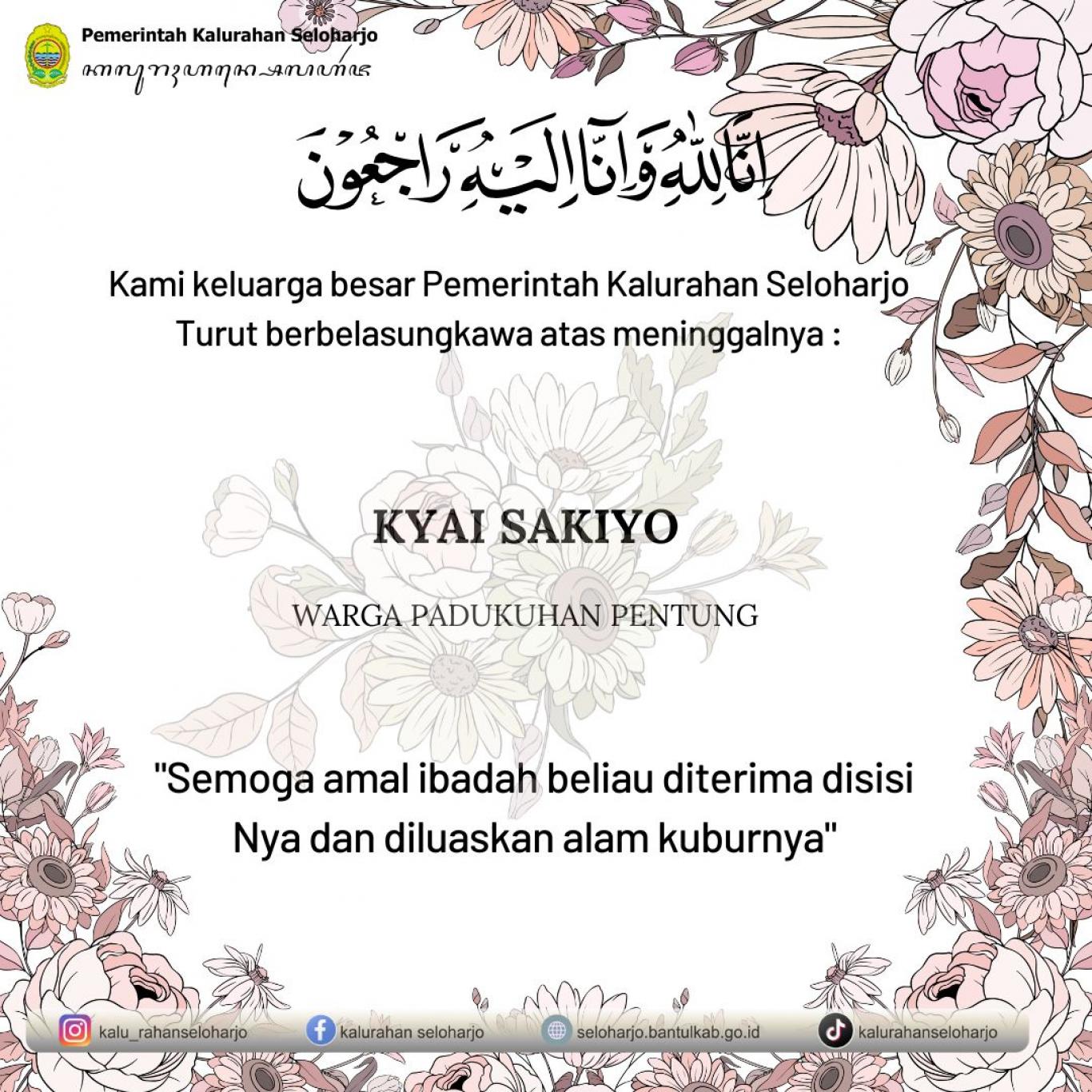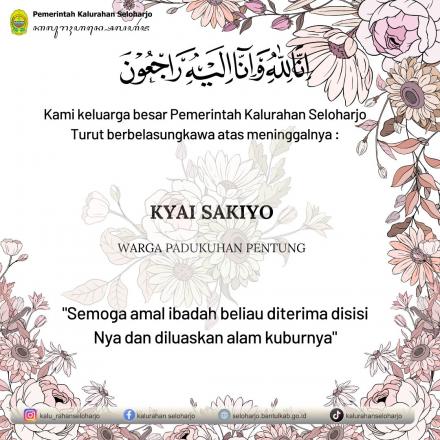 Seloharjo- Innalilahi wa innailaihi rojiun telah meninggal dunia Almarhum Kyai Sakiyo di Padukuhan Pentung. Pemerintah Kalurahan Seloharjo mengucapkan turut berbelasungkawa yang sedalam-dalamnya atas meninggalnya Almarhum Kyai Sakiyo di Padukuhan Pentung pada Sabtu, 21 Maret 2026. Semoga Almarhum Husnul Khotimah, Diampuni segala khilaf dan dosanya serta di tempatkan di surga Allah SWT.